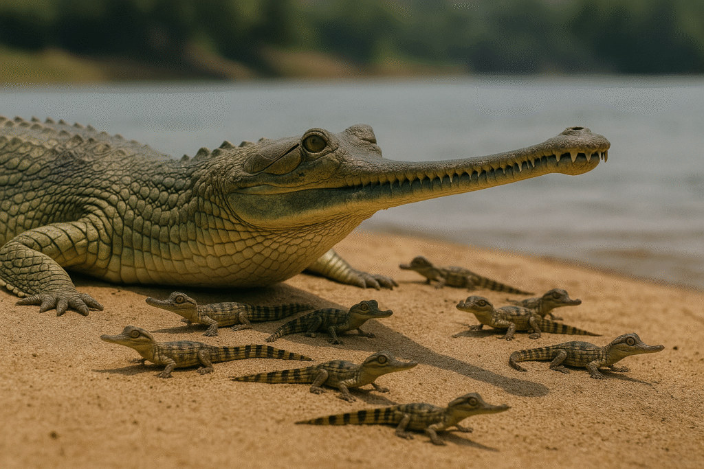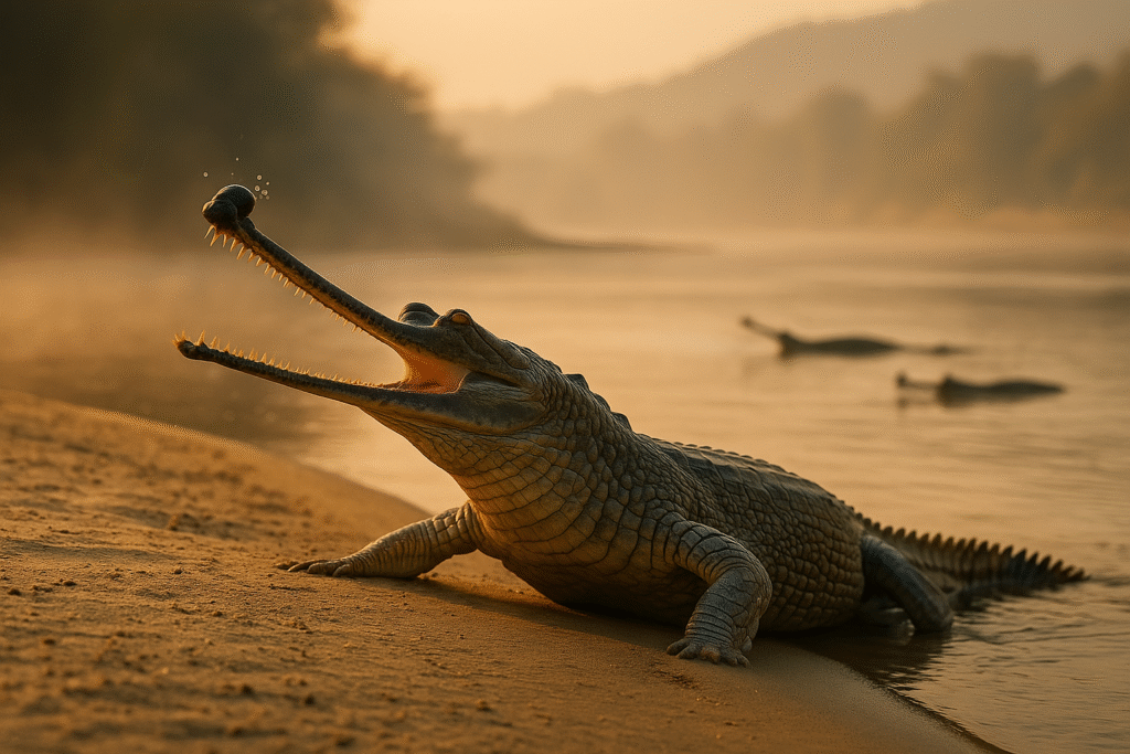 Gharial legacy of antiquity on India’s ancient rivers is the focus of this story.Dawn lays pewter light on a sandbar. Twenty meters out, a long, silver-gray shape surfaces: a male gharial. At the tip of his needle snout sits a dark bulb—the ghara, a hollow “pot” of keratin. He draws breath, inflates, and trumpets—a resonant, bubbling call that makes the sand vibrate. Females align along the current like commas in a sentence; juveniles raft across his back. In a landscape older than any fort on its banks, a sound from prehistory writes the morning’s first paragraph.
