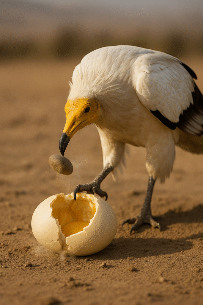 Heat wavered over a Sahel pan. In the center lay a sun-bleached ostrich egg—too thick for talons, too tough for a beak. A white-and-black raptor trotted in, picked up a smooth pebble, and hammered the egg until the shell spidered and caved. The bird stepped back, dipped its bill, and fed with the prim posture of a surgeon. Few wild scenes feel as old as that: a vulture using a tool on an African plain, doing what its lineage has likely done for millennia.
