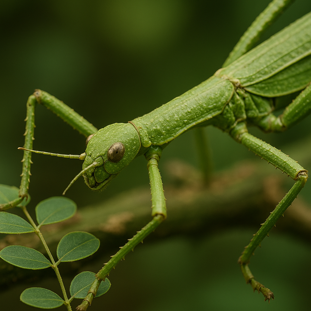 The Goliath Stick Insect is a masterwork of natural design. Its body is elongated, angular, and textured, mimicking the exact form of forest twigs and branches. Females, the larger of the sexes, can be as long as a human forearm, with wings patterned like green leaves. Males, slimmer and shorter, rely even more heavily on stillness and camouflage. When both genders hold motionless on a branch, they simply cease to exist to predators.