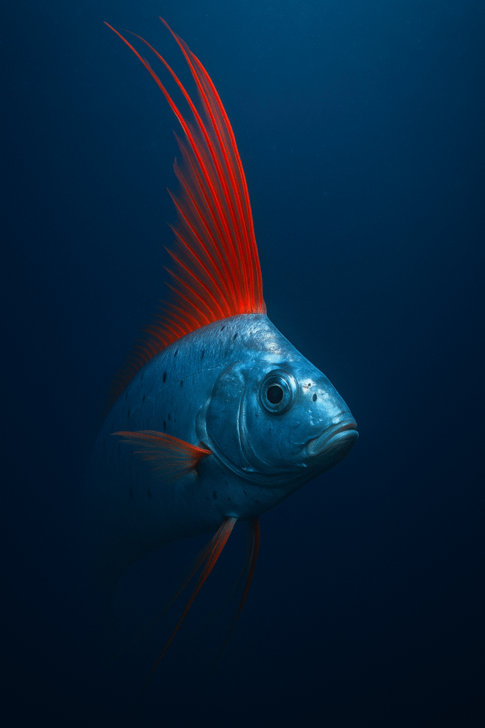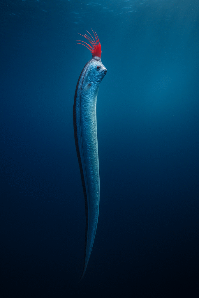 Unlike the muscular predators of the open sea, the oarfish is fragile and ethereal. Its long, ribbon-like body undulates with slow, wave-like motions, powered by a continuous fin that runs along its length. The brilliant crimson dorsal fin on its head—like a crown of flames—stands erect as it hovers vertically in the water column, perhaps using this unusual posture to stalk plankton, squid, and small fish drifting beneath it.