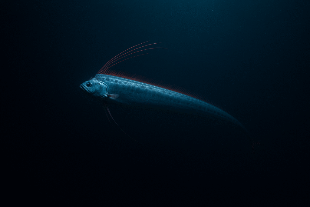 Its skeleton is reduced, its scales are delicate, and its muscles weak compared to other giants of the deep. The oarfish survives not through strength, but through invisibility: it occupies a world beyond sunlight, where its silvery sheen melts into the water’s shimmer, a living blade of moonlight.