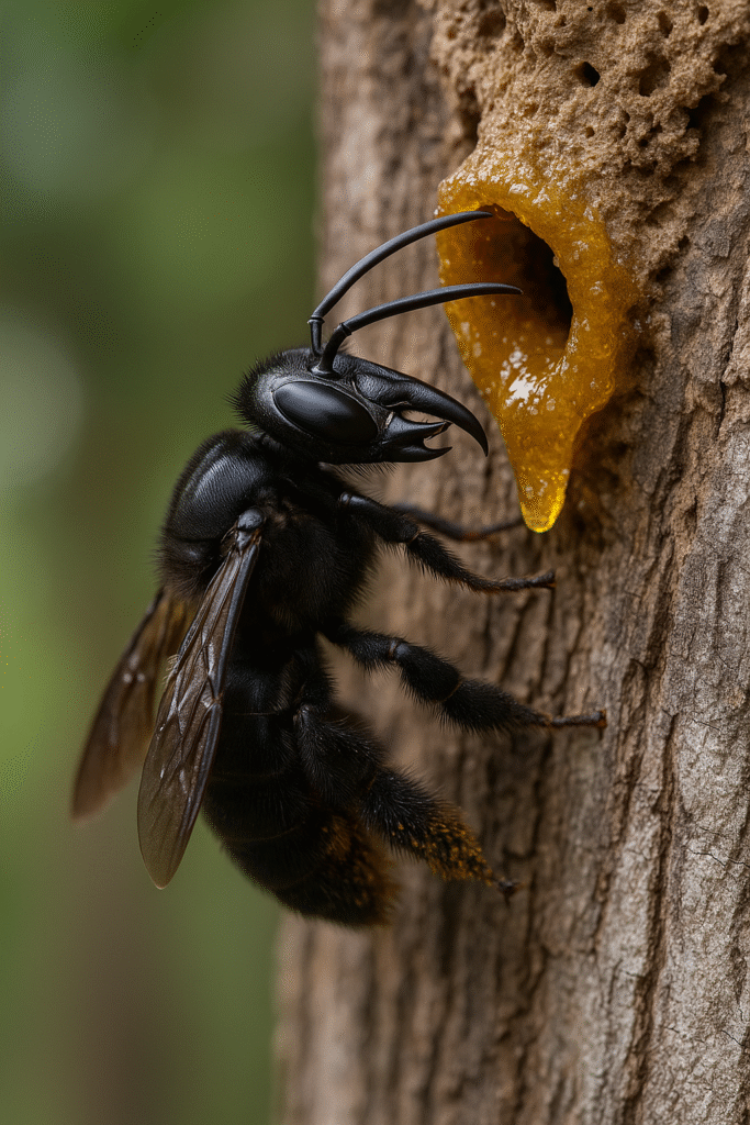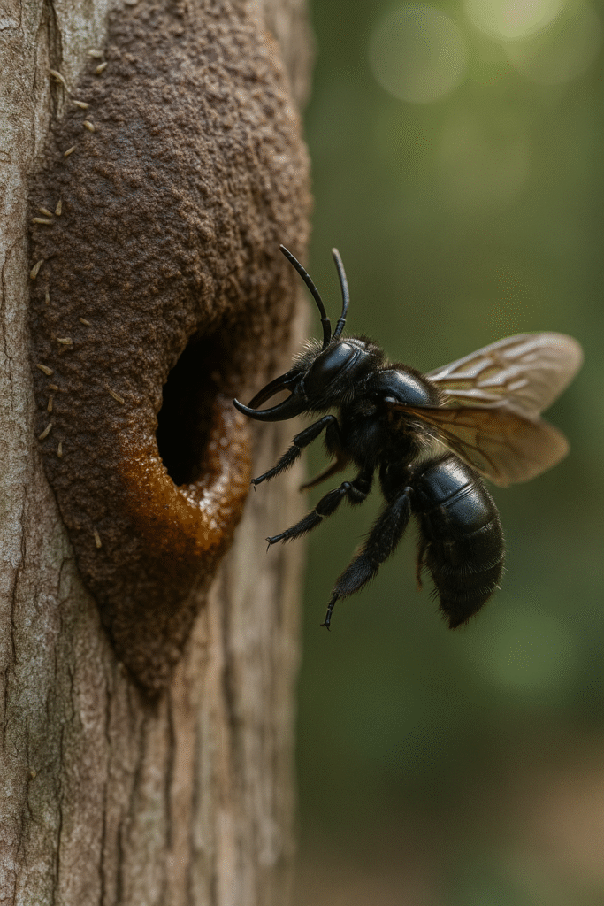 - Signs: Fresh, varnished entrance on the side of a termite nest; resin smears on nearby bark; that unmistakable deep buzz.